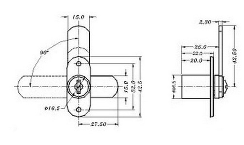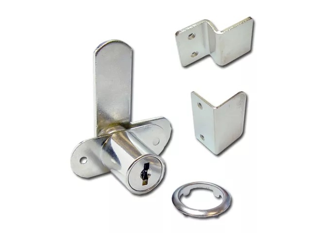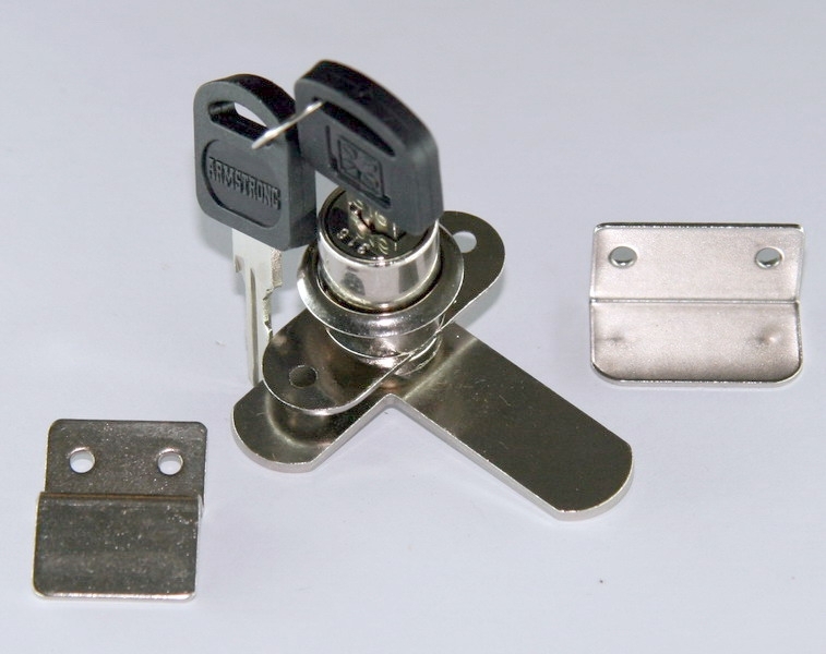505-14 Камлок для двойной (двустворчатой) распашной дверцы фирмы ARMSTRONG, система одинаковые ключи. Комплектация с одинаковыми ключами обеспечивает ТОЛЬКО 1 вариант ключа (№ 131!) на всю партию замков (все ключи - одинаковые!!!), таким образом ключ от любого замка открывает все остальные замки. 'Г'-образный кам, цилиндр d16,5 x 22 мм. позволяет запереть обе створки двойной двери без применения дополнительных шпингалетов и защелок. Крепление к фасаду за фланец 2-мя шурупами. Номер выбит на ключе и на замке.